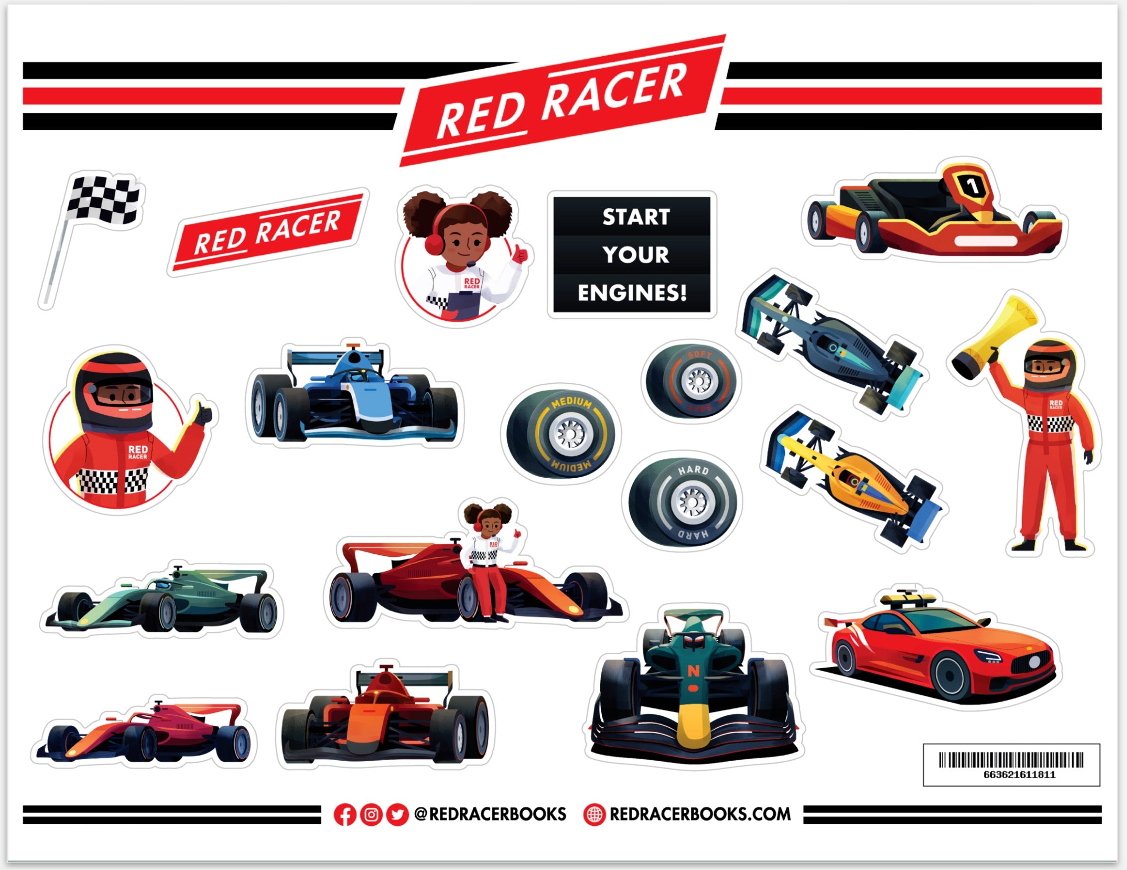 Hojas de calcomanías de vinilo premium con ilustraciones en colores vibrantes de la familia Red Racer Books. 19 pegatinas por hoja.